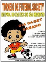 Com o objetivo de conseguir recursos para a realização do XVII Encontro de Casais com Cristo da Paróquia São Benedito, a Equipe de Cor Preta da Gincana ECC 2010 estará promovendo um Torneio de Futebol Society no próximo dia 04 de Setembro, às 17h00min. O local será no campo da Rua Romeu Martins, quase esquina com Av. João Pessoa. O torneio terá apenas 6 times, cada qual com o número mínimo de 7 jogadores.