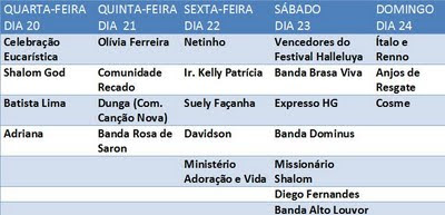 Confira abaixo a programação do Festival Halleluya 2011, que tem início nesta quarta-feira (dia 20), às 19h00min, no Condomínio Espiritual Uirapuru (CEU). O evento traz os melhores artistas da música católica para Fortaleza, com uma mistura de ritmos que promete agradar a todos os públicos: