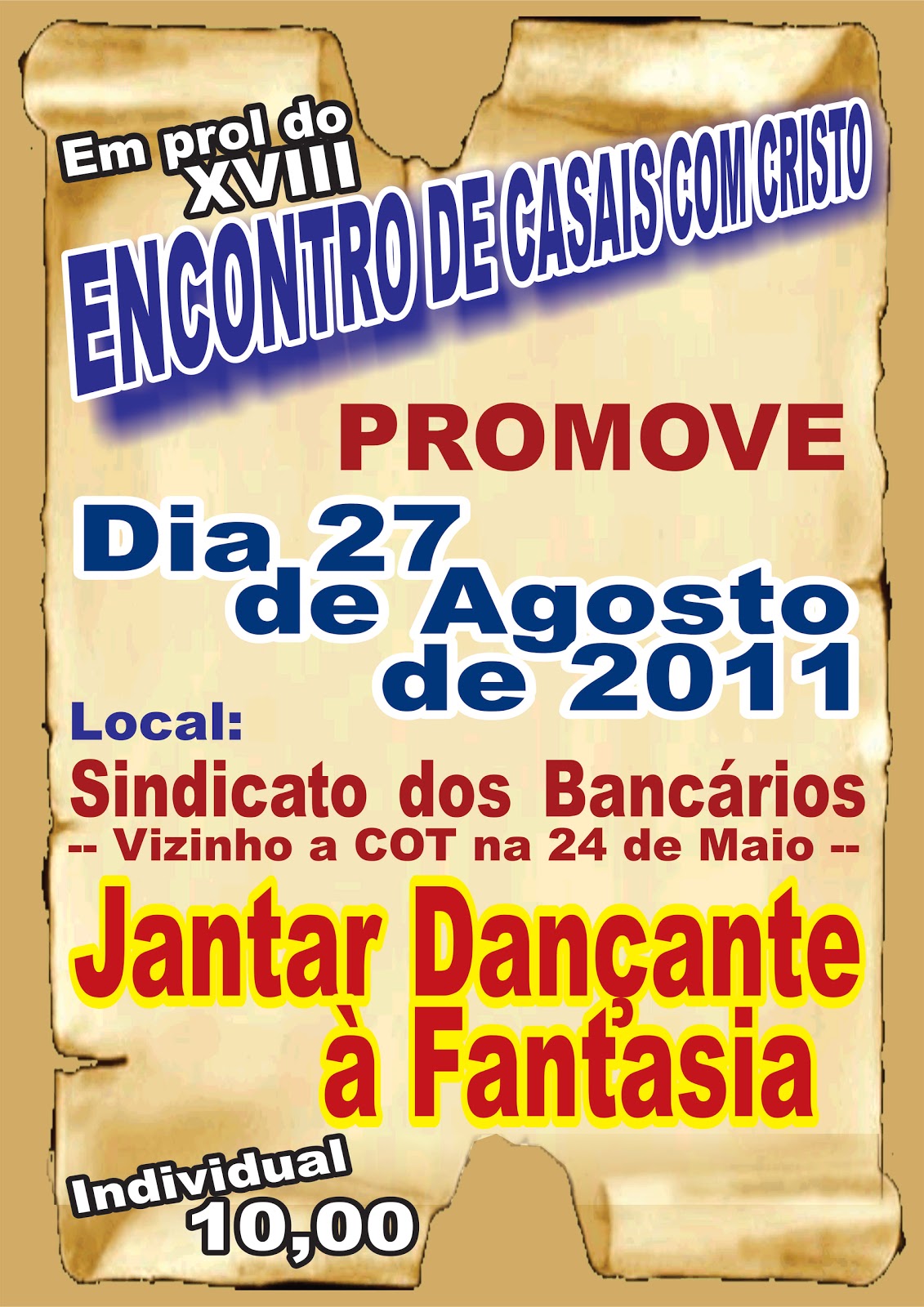 O ECC – Encontro de Casais com Cristo – da Paróquia São Benedito estará promovendo no dia 27 de Agosto de 2011, no Sindicato dos Bancários, um Jantar Dançante à Fantasia. O ingresso individual custa apenas R$ 10,00 e poderá ser comprado com qualquer casal membro do ECC de nossa paróquia. O sindicato dos bancários fica na Rua 24 de Maio, nº 1289 – Centro (vizinho a COT).