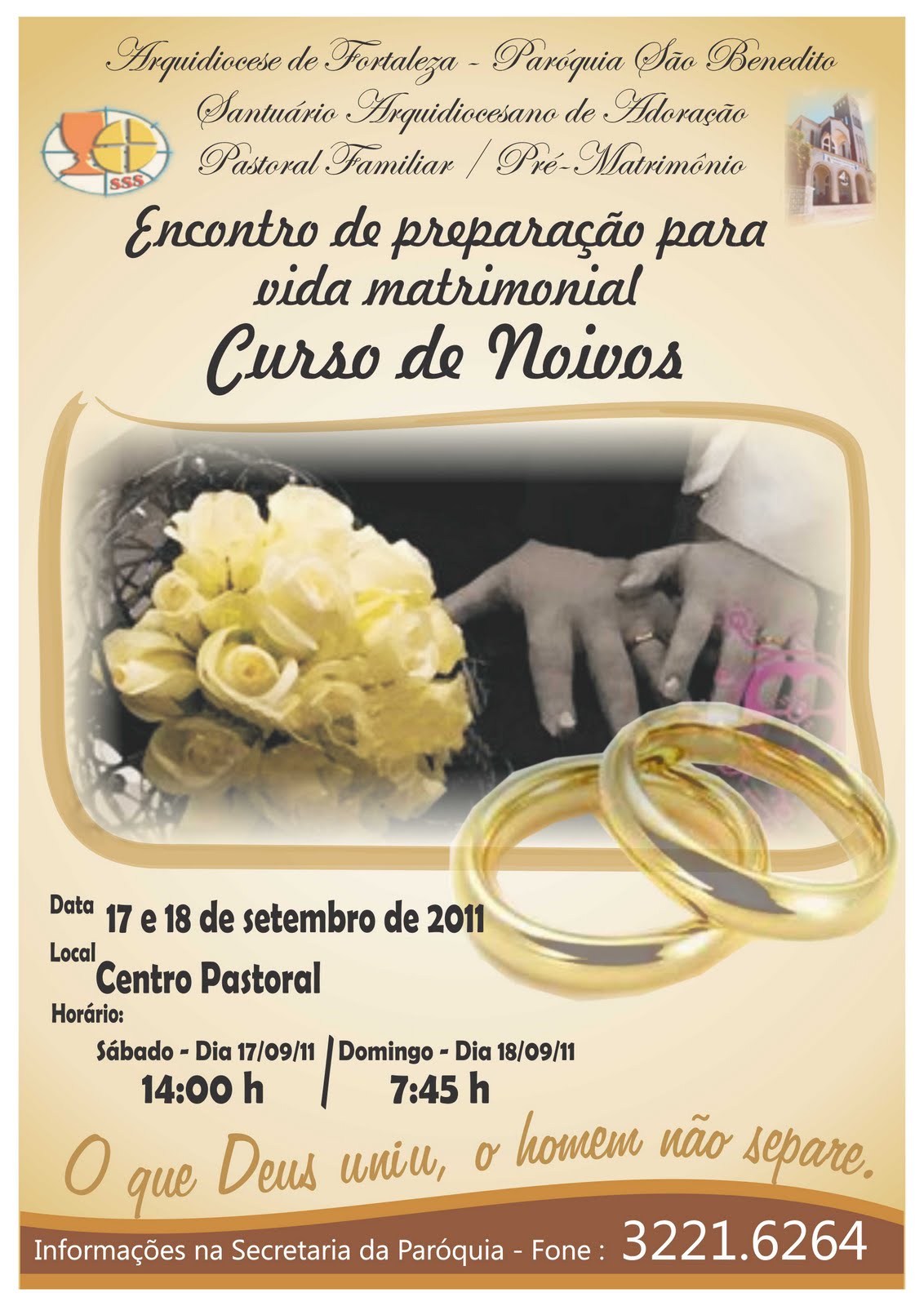 O Setor Pré-Matrimonial da Pastoral Familiar da Paróquia São Benedito realizará nos dias 17 e 18 de setembro mais um Encontro de Preparação para Vida Matrimonial. O popularmente conhecido Curso de Noivos tem como objetivo auxiliar os novos casais para a vida matrimonial e familiar, que os mesmos estarão assumindo após receberem o Sacramento do Matrimônio.