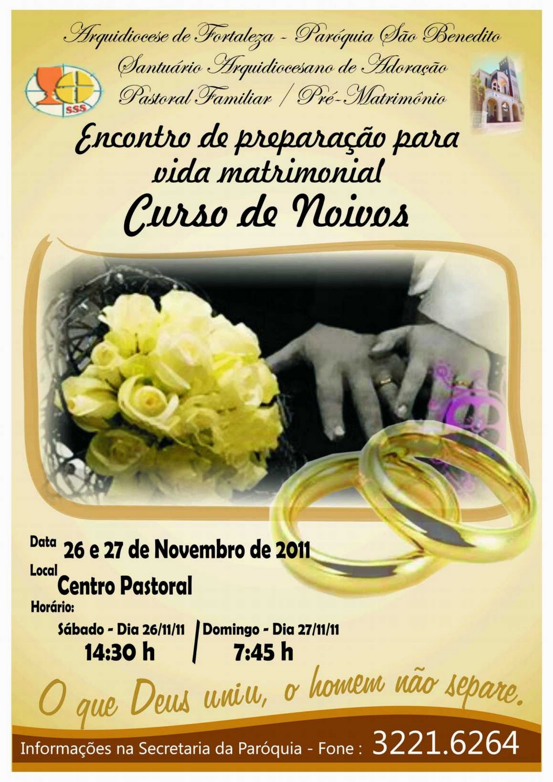 O Setor Pré-Matrimonial da Pastoral Familiar da Paróquia São Benedito realizará nos dias 26 e 27 de novembro mais um Encontro de Preparação para Vida Matrimonial. O popularmente conhecido Curso de Noivos tem como objetivo auxiliar os novos casais para a vida matrimonial e familiar, que os mesmos estarão assumindo após receberem o Sacramento do Matrimônio.