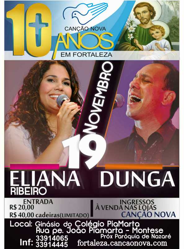 Comemorando os 10 anos da casa de missão da Comunidade Canção Nova em Fortaleza, dia 19 de novembro, no ginásio do Colégio Piamarta, haverá um show com os missionários Eliana Ribeiro e Dunga. Os ingressos estão à venda nas lojas canção Nova.