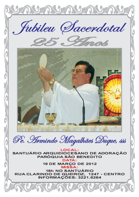 A Paróquia São Benedito tem a alegria de convidar toda a comunidade paroquial, amigos e familiares para a Celebração Eucarística em Ação de Graças pelos 25 anos de Ordenação Sacerdotal do nosso querido Padre Magalhães, sss.