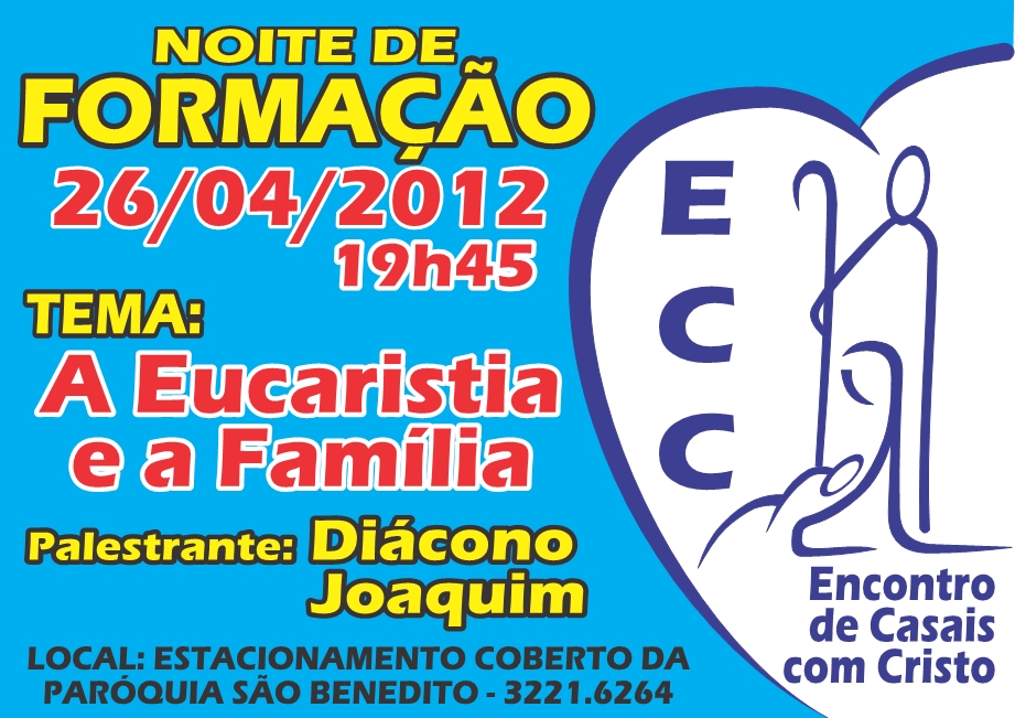 O ECC da Paróquia São Benedito lhe convida para mais uma Noite de Formação no próximo dia 26/04, às 19h45min, no estacionamento coberto da paróquia. O tema “A Eucaristia e a Família” será apresentado pelo Diácono Joaquim. Venha e participe!