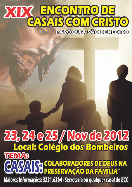 Com esse objetivo a Paróquia São Benedito informa que estão abertas as inscrições para o XIX Encontro de Casais com Cristo, que será realizado nos dias 23, 24 e 25 de novembro de 2012. Maiores informações na secretaria da igreja pelo telefone (85) 3221-6264 ou com qualquer casal do ECC de nossa paróquia.