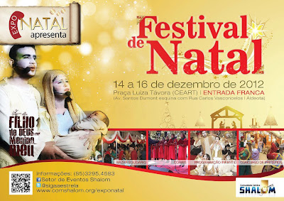 Está chegando a EXPONATAL 2012! De 14 a 16 de dezembro, na Praça Luíza Távora (CEART). Espetáculo Filho de Deus, Menino Meu, Concurso de presépios, Bazar solidário, Lançamento do CD Príncipe da Paz, Apresentação de corais e uma ótima oportunidade de confraternização! Traga sua família e amigos e vamos experimentar o verdadeiro sentido do Natal! Você que é de Fortaleza não pode perder este super evento! O Filho de Deus quer nascer em você! Saiba mais em www.comshalom.org.