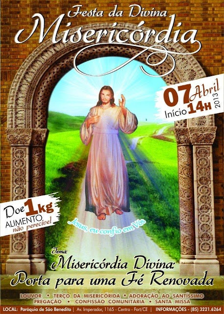 A Festa constitui um tempo de graça para toda humanidade e ocupa um lugar privilegiado entre todas as formas de divulgação à Misericórdia Divina. O tema deste ano será “Misericórdia Divina: Porta para uma Fé Renovada”. A Pastoral da Divina Misericórdia de nossa paróquia tem a missão de promover, todos os anos, a Festa da Divina Misericórdia no Santuário de São Benedito, localizado na Av. do Imperador, 1165 – Centro. Maiores informações pelo fone (85) 3221-6264.