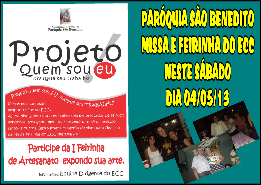 O ECC – Encontro de Casais com Cristo – da Paróquia São Benedito informa que amanhã (dia 4/5), às 18 horas, teremos a Missa do ECC no Santuário Arquidiocesano e a Feirinha do ECC no estacionamento coberto. Além da nossa tradicional feirinha, o ECC estará dando continuidade ao Projeto Quem Sou Eu!, Feirinha de Artesanato, homenagem as mães, sorteio de brindes, bingo e outras atrações. Reforçamos para cada casal do ECC o principal objetivo de nossas feirinhas: Criar um espaço de convivência e relacionamento social, além de proporcionar momentos de diversão e descontração. Vamos participar minha gente!