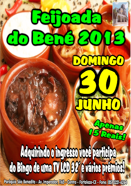 A Paróquia São Benedito realizará no próximo dia 30 de junho a tradicional Feijoada do Bené 2013, em prol das prioridades estabelecidas pela Assembléia Paroquial 2013. Adquirindo o ingresso você participará do Bingo de uma TV LCD 32´ e ainda concorre a vários prêmios no decorrer do evento. Maiores informações na secretaria da paróquia. Participe!