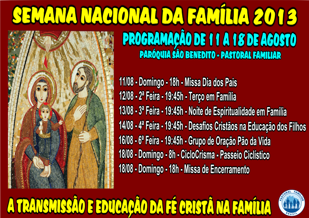 Tem início no próximo domingo (11), e prossegue até o dia 17 de agosto, a Semana Nacional da Família 2013, com o tema “A Transmissão e Educação da Fé Cristã na Família”, considerando, especialmente, a responsabilidade dos pais. O evento é realizado nas comunidades eclesiais do Brasil. A Comissão Episcopal Pastoral para a Vida e a Família da CNBB convida as lideranças paroquiais para promoverem com intensidade e criatividade a família cristã nas comunidades e, principalmente, nas cidades. A Semana Nacional da Família é para todos aqueles que acreditam e amam a família. “Queremos ver nossos filhos crescendo em sabedoria, estatura e graça.” (conforme Lucas 2, 52).