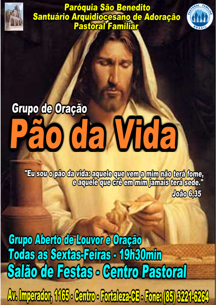 O Grupo de Oração Pão da Vida convida a todos a participarem de nossos momentos de louvor e oração. O grupo é aberto e se reunirá todas as sextas-feiras, às 19h30min, no Salão de Festas do Centro Pastoral.