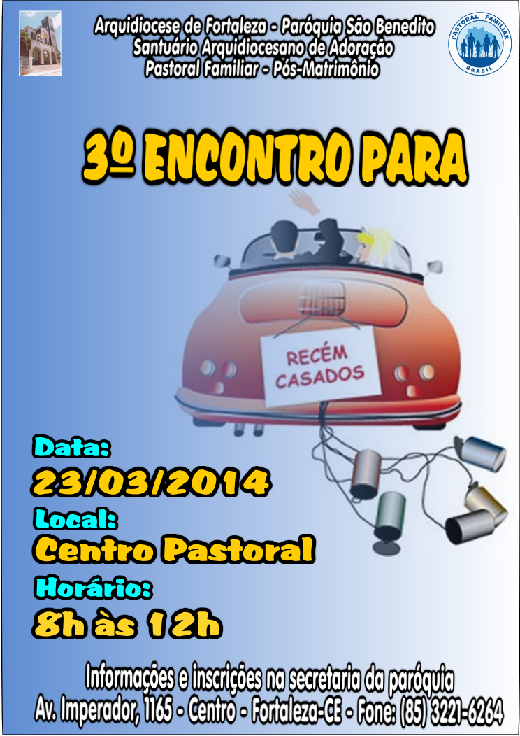 A Pastoral Familiar da Paróquia São Benedito estará promovendo neste domingo (dia 23/03) o 3º Encontro para Recém Casados. A inscrição é gratuita e poderá ser feita no local do encontro. Venha e participe!