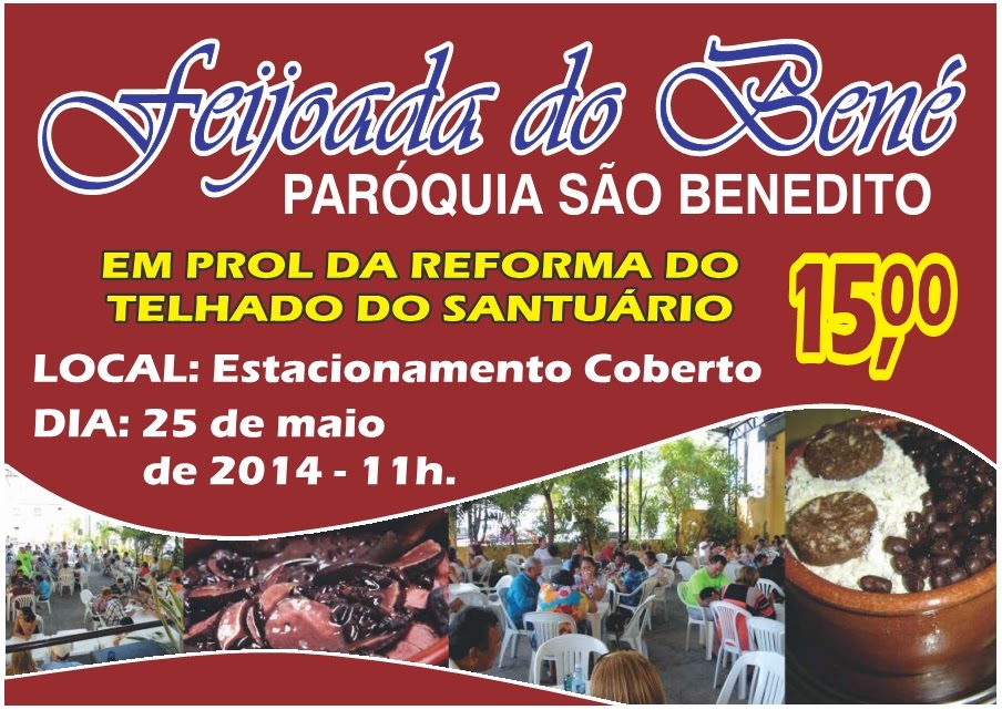 A Paróquia São Benedito estará realizando no dia 25/05 (domingo), 11 horas, no estacionamento coberto, uma Grande Feijoada em prol da reforma do telhado do santuário. Os ingressos podem ser adquiridos na secretaria paroquial ou com os agentes de pastoral da paróquia e custam apenas R$ 15,00. Com o ingresso, além da feijoada, você receberá uma cartela do bingo de um prêmio surpresa. Participe e ajude na reforma do telhado da nossa igreja.