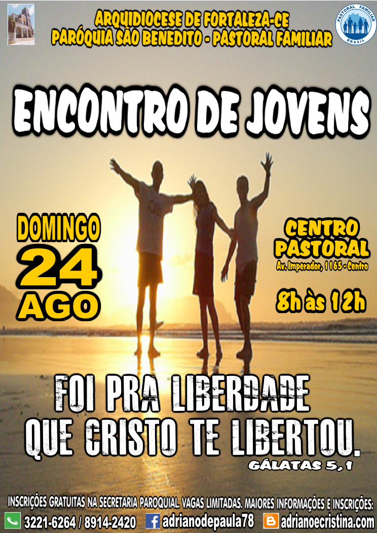 A Paróquia São Benedito estará realizando no próximo dia 24/08 (domingo) o primeiro Encontro de Jovens promovido pela Pastoral Familiar. Com o tema “Foi pra Liberdade que Cristo te Libertou”, o encontro tem o objetivo de proporcionar uma manhã com louvor, dinâmicas, formação e espiritualidade voltada exclusivamente para jovens com idade média de 14 a 25 anos.