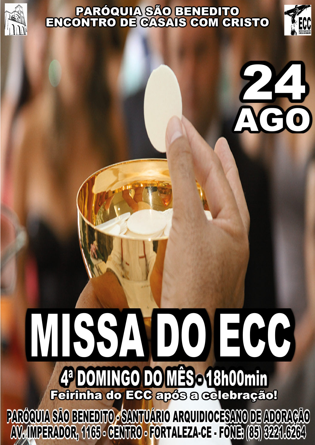 O ECC – Encontro de Casais com Cristo – da Paróquia São Benedito informa que amanhã (dia 24/08), às 18 horas, teremos a Missa do ECC no Santuário Arquidiocesano, com a homenagem aos casais aniversariantes do mês. Após a missa teremos a tradicional Feirinha do ECC, um espaço de convivência e relacionamento social, proporcionando momentos de diversão e descontração. Todos são convidados!