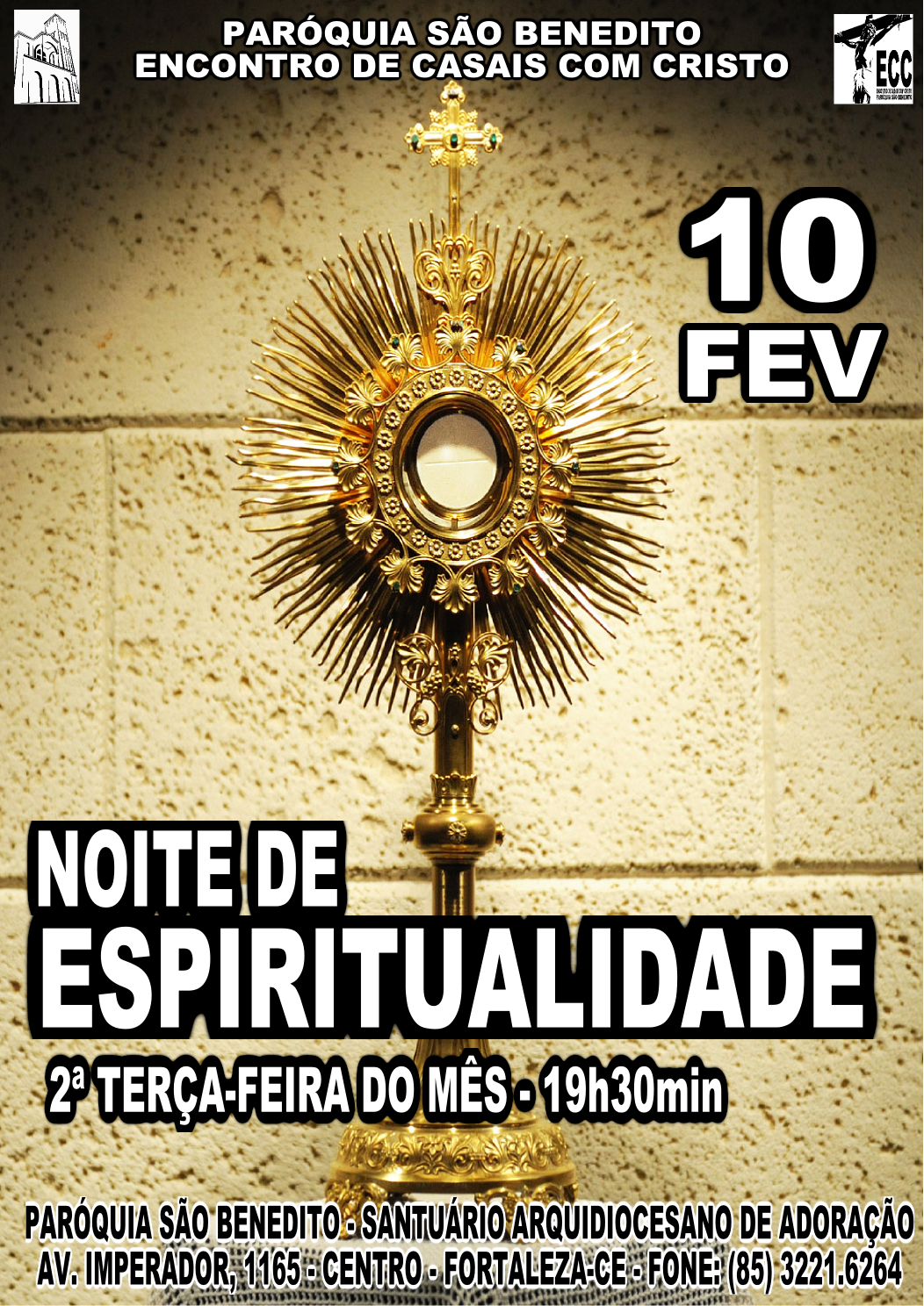 O ECC – Encontro de Casais com Cristo – da Paróquia São Benedito convida a todos para a primeira Noite de Espiritualidade de 2015, que será realizada nesta terça-feira, dia 10/02, no Santuário de Adoração. A Noite de Espiritualidade terá início às 19h30min – com o Terço da Família – e término às 21h00min. Venha participar com sua família e amigos deste momento de Adoração ao Santíssimo Sacramento.