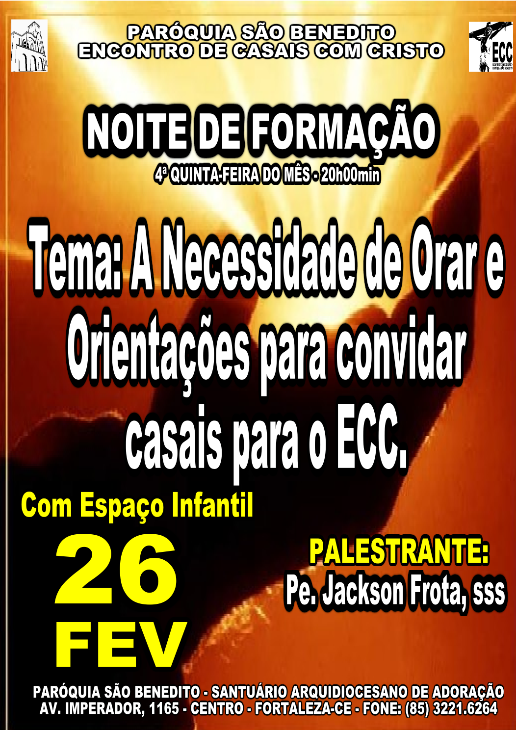 Para nos ajudar a compreender cada vez mais essa verdade, o ECC da Paróquia São Benedito estará realizando no próximo dia 26/02, quinta-feira, às 20 horas, uma Noite de Formação com o tema A Necessidade de Orar. A formação sera conduzida pelo nosso pároco, Pe. Jackson Frota, sss. A formação é aberta para toda a comunidade e todos são convidados!
