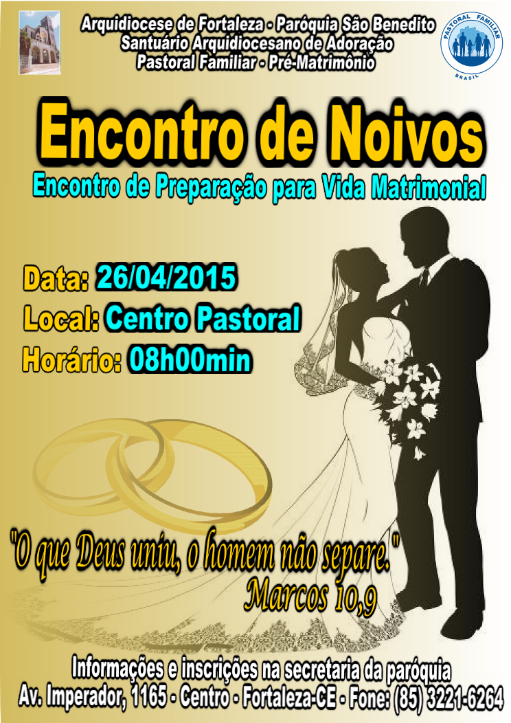A Pastoral Familiar da Paróquia São Benedito realizará no próximo dia 26 de Abril (domingo) o primeiro Encontro de Preparação para Vida Matrimonial deste ano de 2015. O popularmente conhecido Curso de Noivos tem como objetivo auxiliar os novos casais para a vida matrimonial e familiar, que os mesmos estarão assumindo após receberem o Sacramento do Matrimônio.