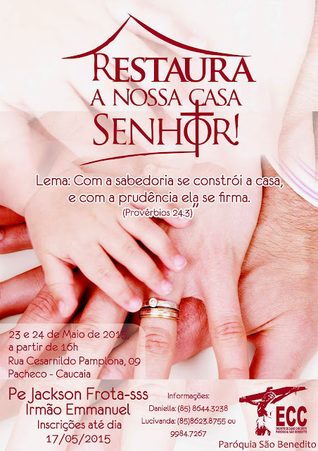 O ECC – Encontro de Casais com Cristo – da Paróquia São Benedito estará realizando nos dias 23 e 24 de maio o Retiro Espiritual 2015, com o tema “Restaura a Nossa Casa Senhor” e o lema “Com a sabedoria se constrói a casa e com a prudência ela se firma.”(Provérbios 24:3).