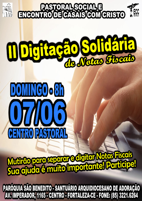 O Encontro de Casais com Cristo, em ação conjunta com a Pastoral Social da Paróquia São Benedito, estará realizando no próximo dia 07/06 (domingo), o 2º Mutirão de Digitação Solidária de Notas Fiscais. O mutirão terá início às 8 da manhã, no Centro Pastoral.