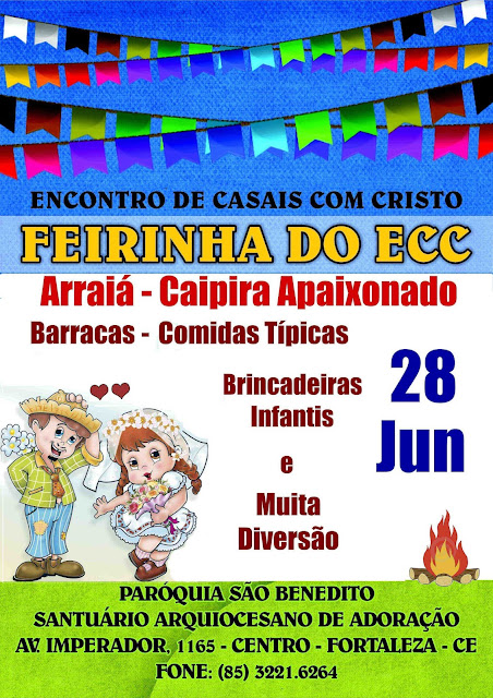 O ECC – Encontro de Casais com Cristo – da Paróquia São Benedito convida a todos os casais encontristas, amigos e familiares para logo após a Missa do ECC, participar da nossa Feirinha Junina com o tema: CAIPIRA APAIXONADO. Teremos barracas com comidas típicas, brincadeiras infantis, música junina e muita diversão.