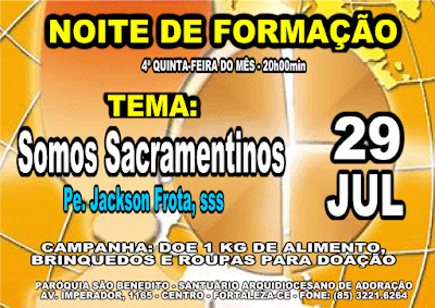 Para nos ajudar a compreender essa grande missão, o ECC da Paróquia São Benedito estará realizando no próximo dia 29/07, excepcionalmente nessa quarta-feira, às 20 horas, uma Noite de Formação com o tema Somos Sacramentinos. A formação será conduzida pelo nosso pároco, Pe. Jackson Frota, sss.