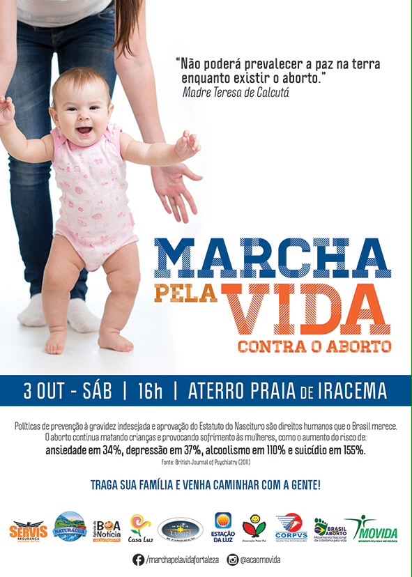 Venha participar da grande Marcha pela Vida 2015. Vamos todos marchar juntos contra a legalização do aborto, por políticas de prevenção a gravidez indesejada e pela aprovação do Estatuto do Nascituro. É neste sábado, dia 03 de Outubro às 16h no Aterro da Praia de Iracema. Entre as atrações está confirmada a presença da Irmã Kelly Patrícia. Convoque toda sua família para marchar e dançar juntos nesse dia de celebração da vida! Saiba mais acessando a página no facebook da Marcha pela Vida 2015.